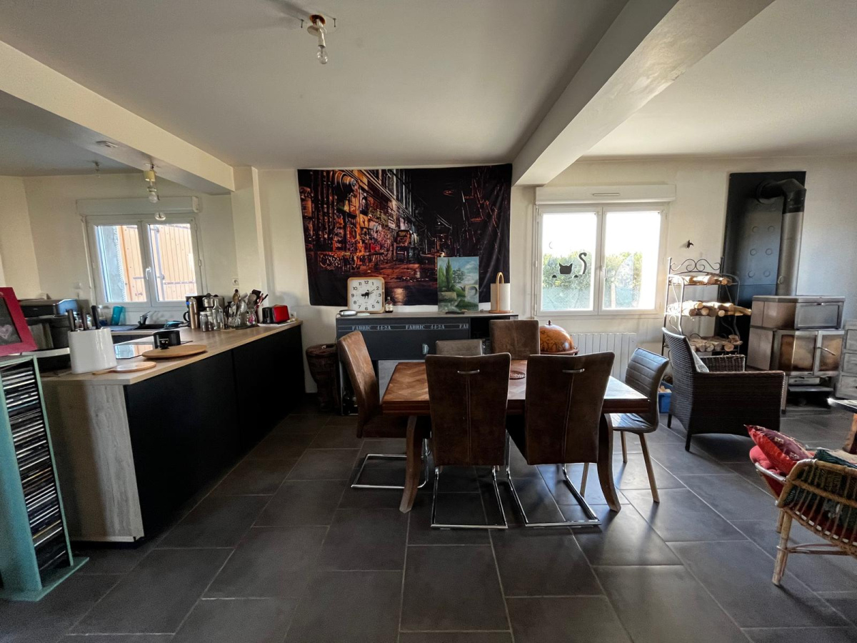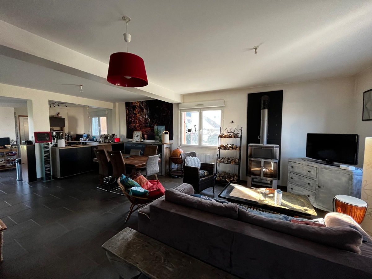 – une pièce de vie spacieuse avec son poêle à bois, ouverte sur une cuisine équipée / aménagée